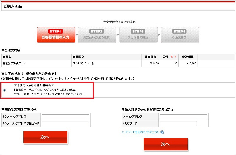 ただし、決済画面にて下記の図の赤枠で囲まれた部分のように、必ず「特典紹介者項目」の表示があることを確認してからお申し込みください。この表示がない場合は特典をお渡しすることができません。